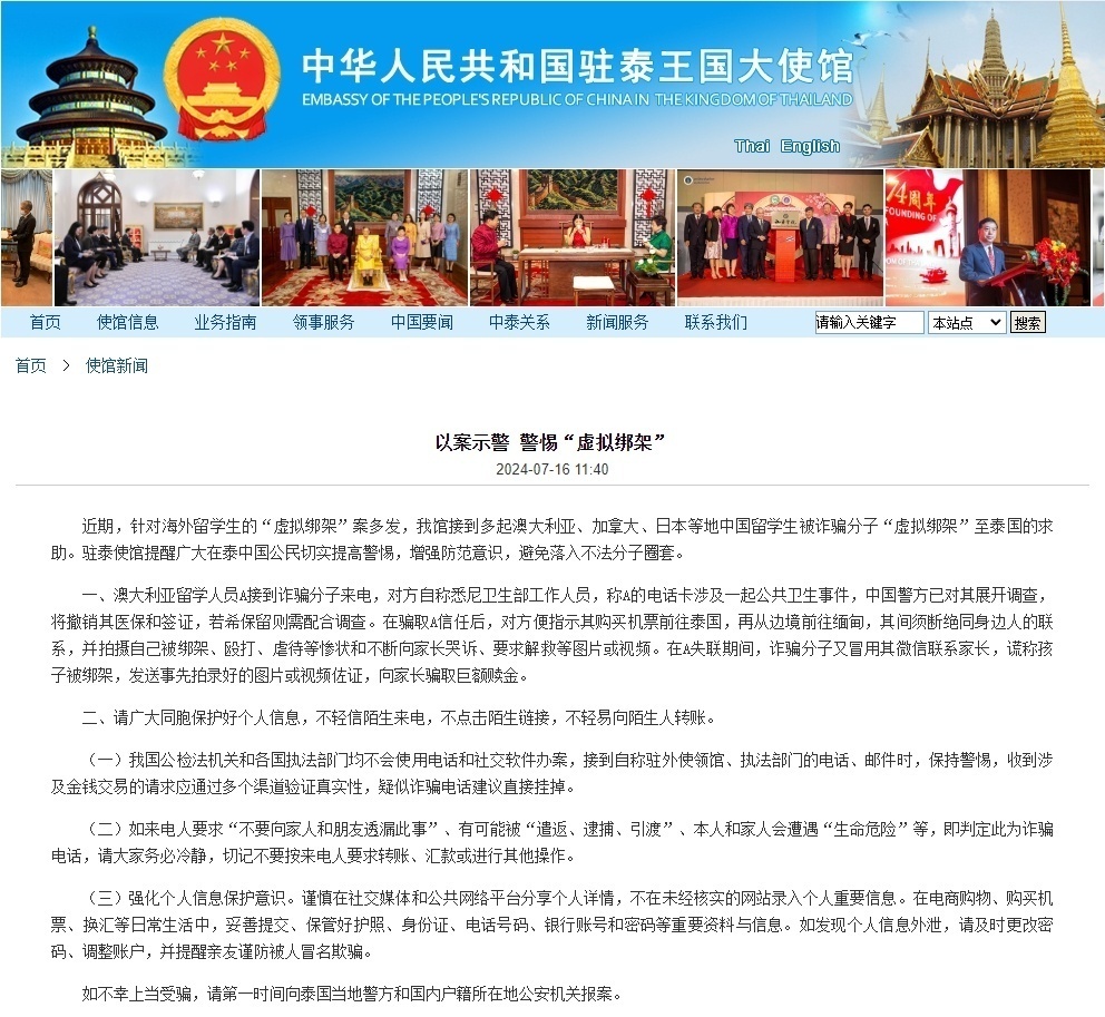 近期,针对海外留学生的“虚拟绑架”案多发,我馆接到多起澳大利亚、加拿大、日本等地中国留学生被诈骗分子“虚拟绑架”至泰国的求助。驻泰使馆提醒广大在泰中国公民切实提高警惕,增强防范意识,避免落入不法分子圈套。